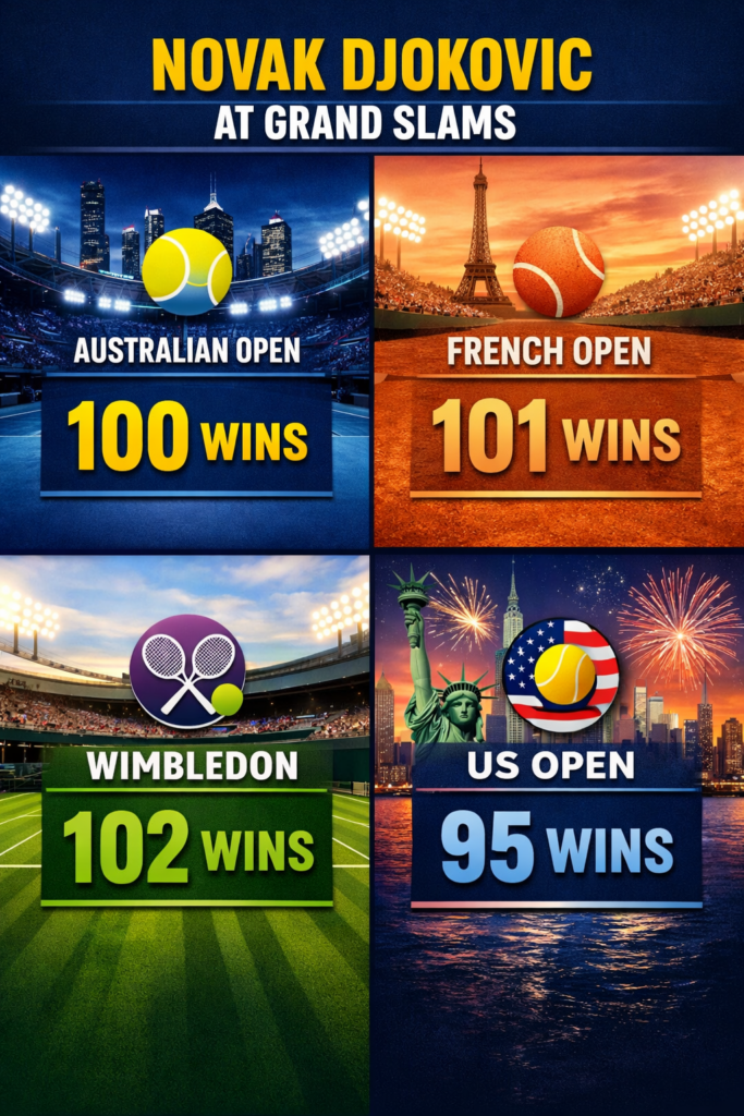 इस जीत के साथ जोकोविच तीन अलग-अलग ग्रैंडस्लैम टूर्नामेंटों में 100 या उससे ज्यादा मैच जीतने वाले दुनिया के पहले खिलाड़ी बन गए हैं। इससे पहले वह फ्रेंच ओपन और विंबलडन में यह मुकाम हासिल कर चुके थे। यूएस ओपन में भी वह 95 जीत के बेहद करीब हैं।