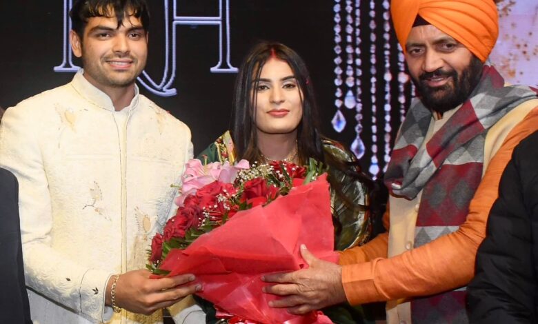 Neeraj Chopra Wedding Reception: देश के चहेते एथलीट और ‘भाला फेंक’ के बेताज बादशाह नीरज चोपड़ा ने अपनी जीवन संगिनी हिमानी मोर के साथ करनाल के ‘द ईडन हॉल’में एक यादगार रिसेप्शन पार्टी दी। हिमाचल प्रदेश के सोलन में गोपनीय तरीके से विवाह बंधन में बंधने के बाद, यह पहला बड़ा सार्वजनिक समारोह था।